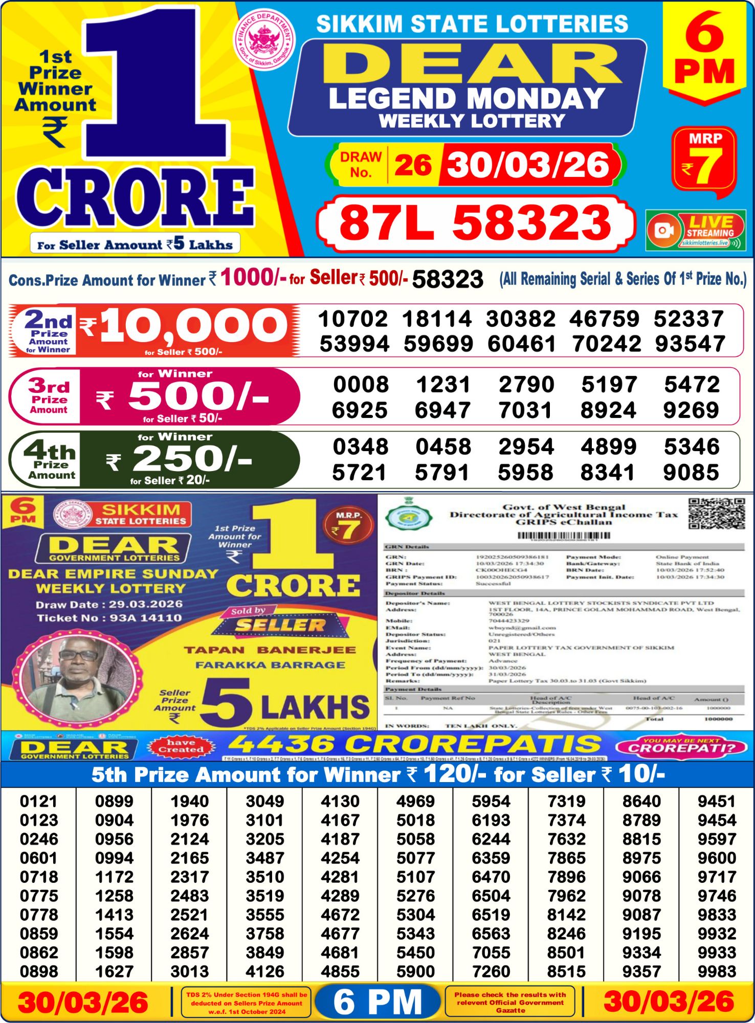 A: Dear Legend Monday weekly lottery result aaj 6 baje ke baad isi page par update ho chuka hai (30/03/2026).